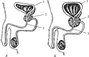 Схематическое изображение органов нижнего отдела мочевыводящей системы мужчины: А — в норме; Б — при аденоме предстательной железы: 1 — мочевой пузырь; 2 — предстательная железа; 3 — уретра.