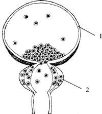 Расположение α-адренорецепторов в мочевом пузыре и предстательной железе: 1 — мочевой пузырь; 2 — предстательная железа