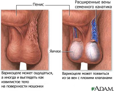 Слева: Варикоцеле может ощущаться, а иногда и выглядеть как извилистое тело на поверхности мошонки; справа: варикоцеле может появиться из-за вен с плохими клапанами