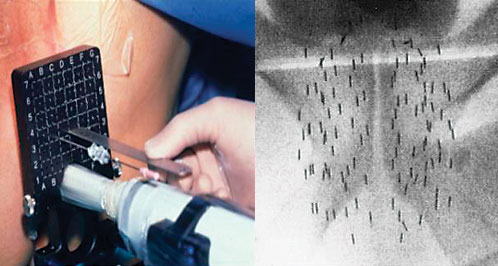 Альтернативным способом лучевой терапии является введение в простату небольших «капсул», содержащих радиоизотопы. Поскольку облучение строго ограничено пределами предстательной железы, этот метод снижает побочные эффекты терапии. Брахитерапия – далеко не новый методлечения. Первоначально капсулы вводились в простату во время хирургической операции, что удлиняло процедуру. Теперь капсулы устанавливаются с применением специальных игл, которые вводятся через кожу позади мошонки.