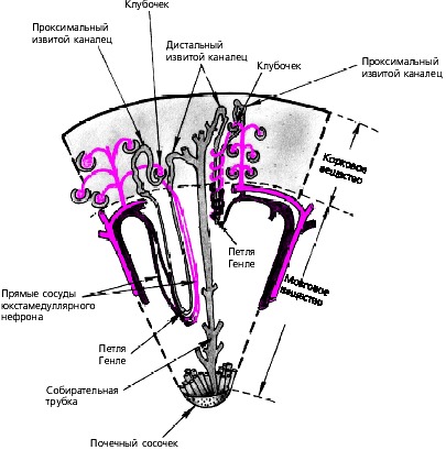 Последняя петля продолжается в выносящий сосуд, в этом же месте сосудистого полюса в тельце входит приносящая клубоч-ковая артериола. Между приносящим и выносящим сосудами имеются 4 типа клеток, образующих юкста-гломерулярный комплекс, ответственный за выработку ренина. На противоположном полюсе (канальцевом) начинается мочевой, или почечный каналец. В канальцевом звене нефро-на выделяют проксимальный отдел, петлю с нисходящей и восходящей частями и дистальный отдел. К прямым канальцам относят нисходящую и восходящую часть петли нефрона. Извитой каналец дистального отдела контактирует с почечным тельцем и отсюда направляется в собирательную почечную трубочку, которой заканчивается нефрон. Основная часть нефрона располагается в корковом веществе почки. В мозговом веществе находятся главным образом прямые канальцы, т.е. оба колена петли нефрона. Собирательные канальцы проходят в пирамидах, заканчиваясь на их верхушке (почечном сосочке). В обеих почках содержится до 2— 2,5 млн нефронов. Длина мочевого канальца каждого нефрона около 50 мм, а общая протяженность всех канальцев в двух почках приближается к 100 км.
