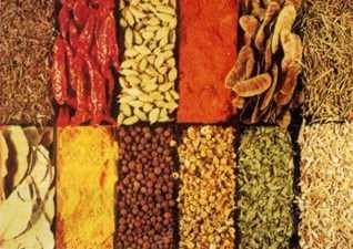 Набор сушеных трав (сверху слева по часовой стрелке): очанка, стручки перца, кардамон, молотый перец, стручки сенны, розмарин, фенхель, эстрагон, цветки ромашки, ямайский перец, куркума длинная, лавровый лист