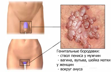 Благодаря молекулярно-гибридизационным методам стало известно, что существует много типов папилломавирусов, 30 из них инфицируют половые органы и область заднего прохода. У женщин инфицируется и покрывается генитальными бородавками область преддверия влагалища, стенки влагалища, шейка матки, наружное отверстие уретры. У мужчин поражается головка полового члена, крайняя плоть, мошонка, анальная область. В родах папилломавирус передается новорожденному ребенку, вызывая у него папилломатоз гортани.
