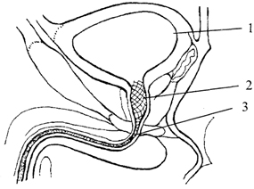 Расположение α-адренорецепторов в мочевом пузыре и предстательной железе: 1 — мочевой пузырь; 2 — предстательная железа